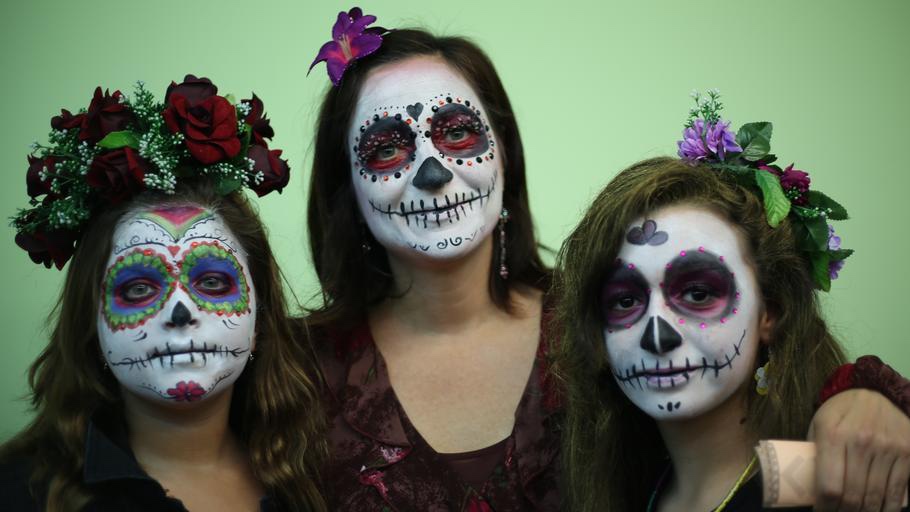 Children dress up on Halloween, but ask for dead children to come back to visit. The celebration is for 3 days and the grown ups also dress up, in hopes of making the dead feel more welcomed, should they decide to come back to visit. The homes are decorated with sugar skulls, bread of the dead and other Day of the Dead decorations.